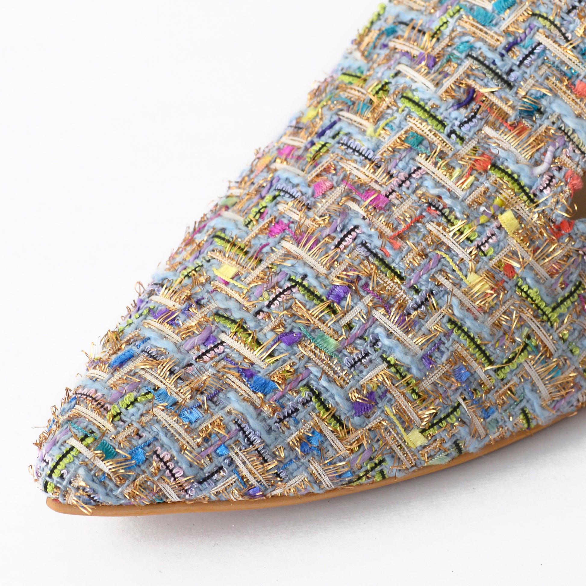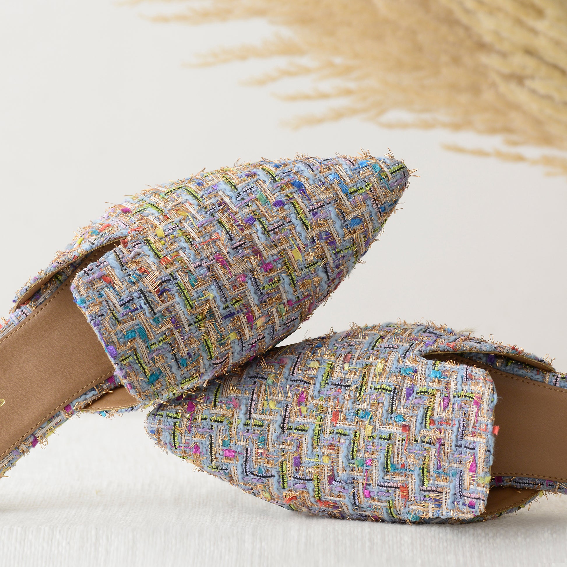 Indulge in the allure of classic Tweed and easy slip-on styling with our blue tweed women's pointed mules.Make a statement with every step and let your footwear reflect your impeccable taste.