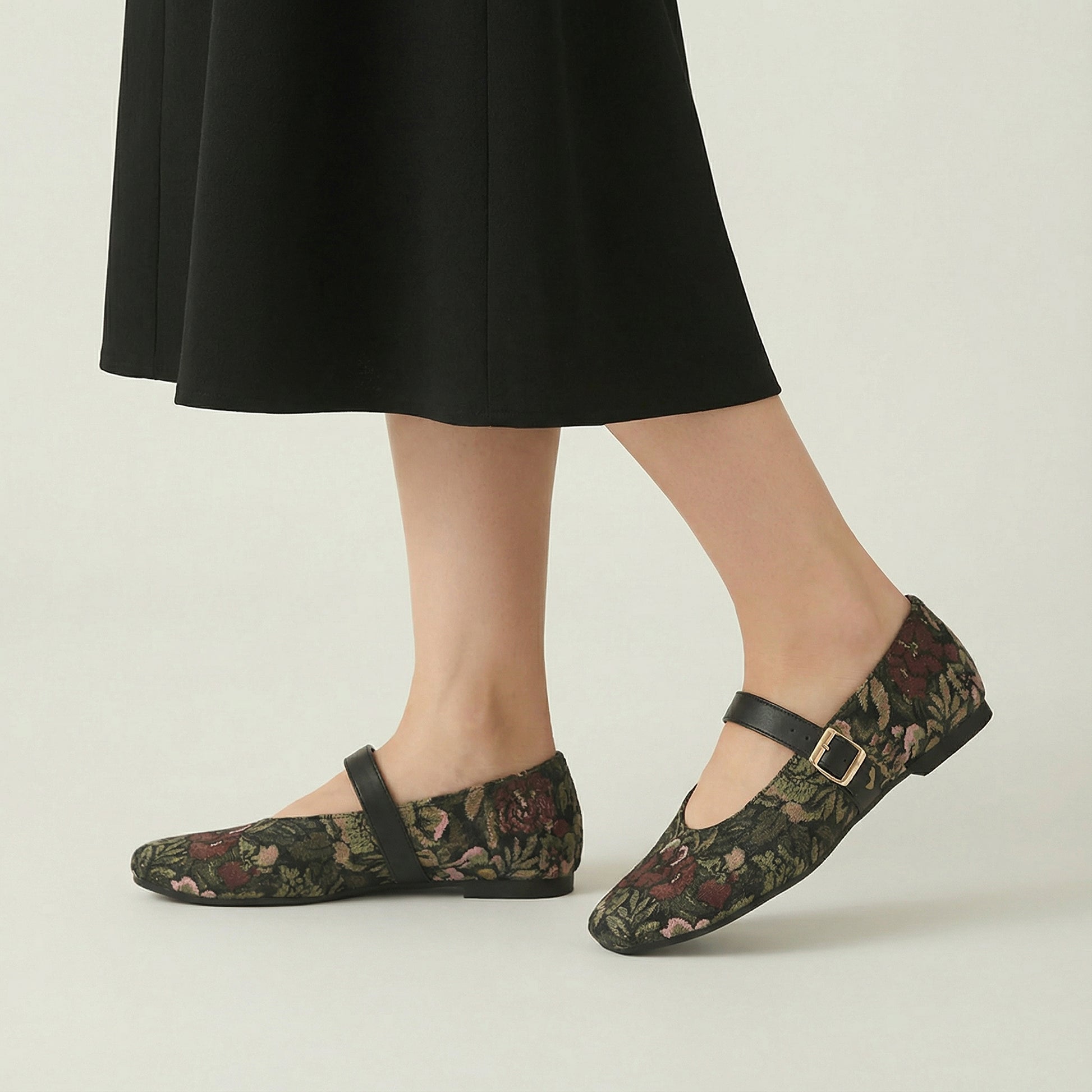 Infused with vintage romance and thoughtful detailing, these square-toe Mary Jane flats are designed to elevate everyday style. Featuring a multicolored floral jacquard upper, a sleek black strap, and lightweight construction, they strike the perfect balance between artful elegance and practical wearability.