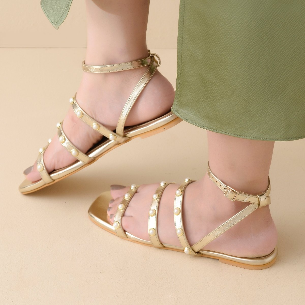 Adorned with dazzling Pearls ,this piece is a delight that will brighten any look. Gold Pearl sandals can be worn from dawn to dusk, pairing perfectly with everything from jeans to eveningwear.