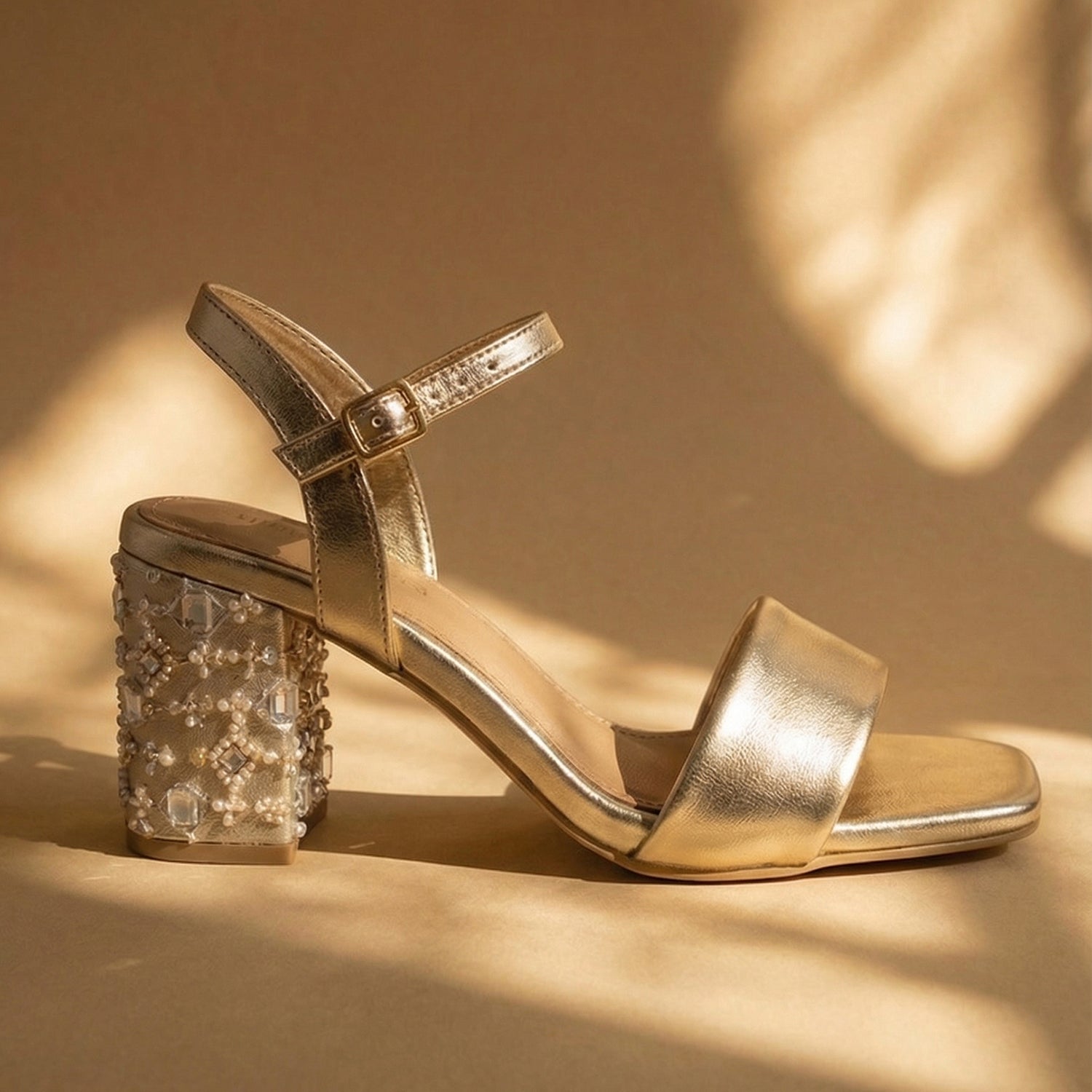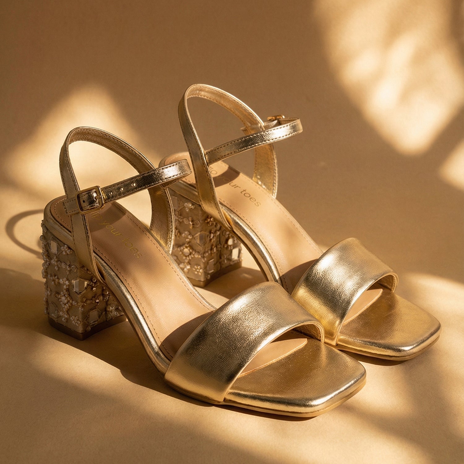 Step into festive glamour with these stunning gold heels, designed with soft cushioning that keeps you comfortable all day and night. The sparkling embellished block heel adds just the right touch of celebration.